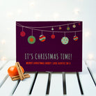 This design features a string of colourful Christmassy baubles on a purple background. ‘It’s Christmas time’ comes as standard text in light blue capital letters and your personalisation will come underneath this in orange capitals.