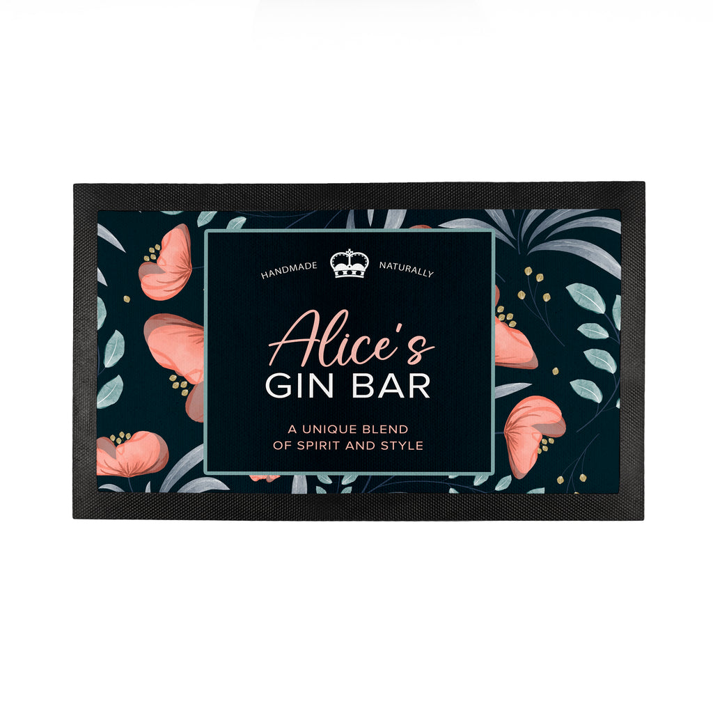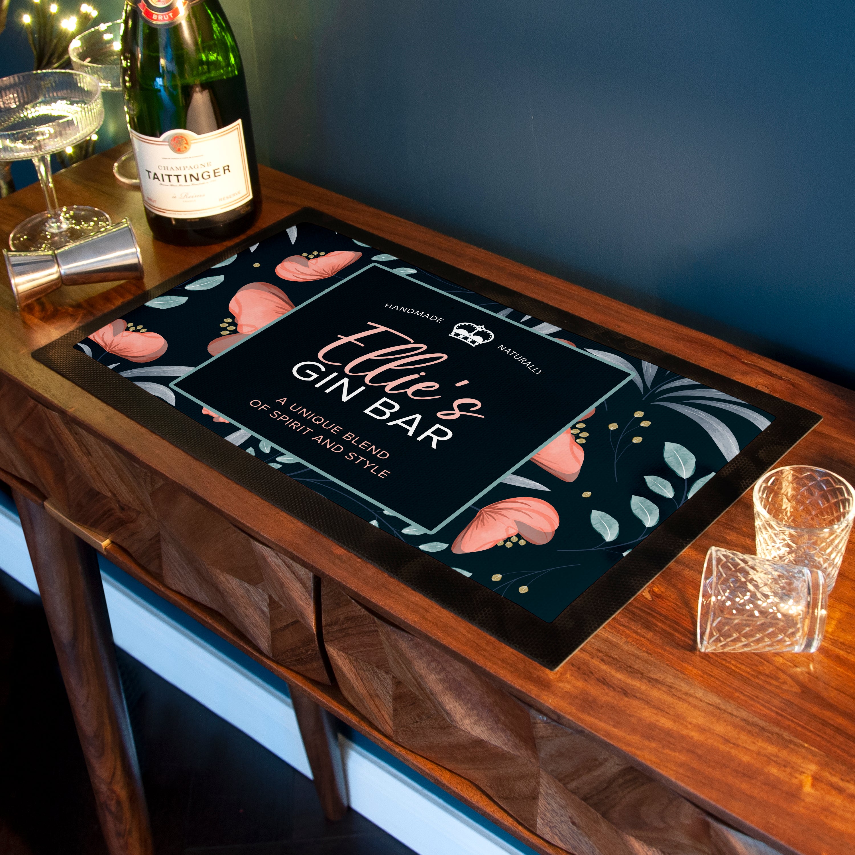 At the centre of this design will be an image that looks like a bar sign. At the top the words ‘Handmade’ and ‘Naturally’ flank a crown icon. Under this your loved one’s name will be written in a pink script font and ‘Gin Bar’ will come as standard text in white capitals. At the bottom of the bar mat, to top off this image, will be the standard text (in pink capitals) ‘A unique blend of spirit and style’ showing how fun and vibrant events at their gin bar will be.