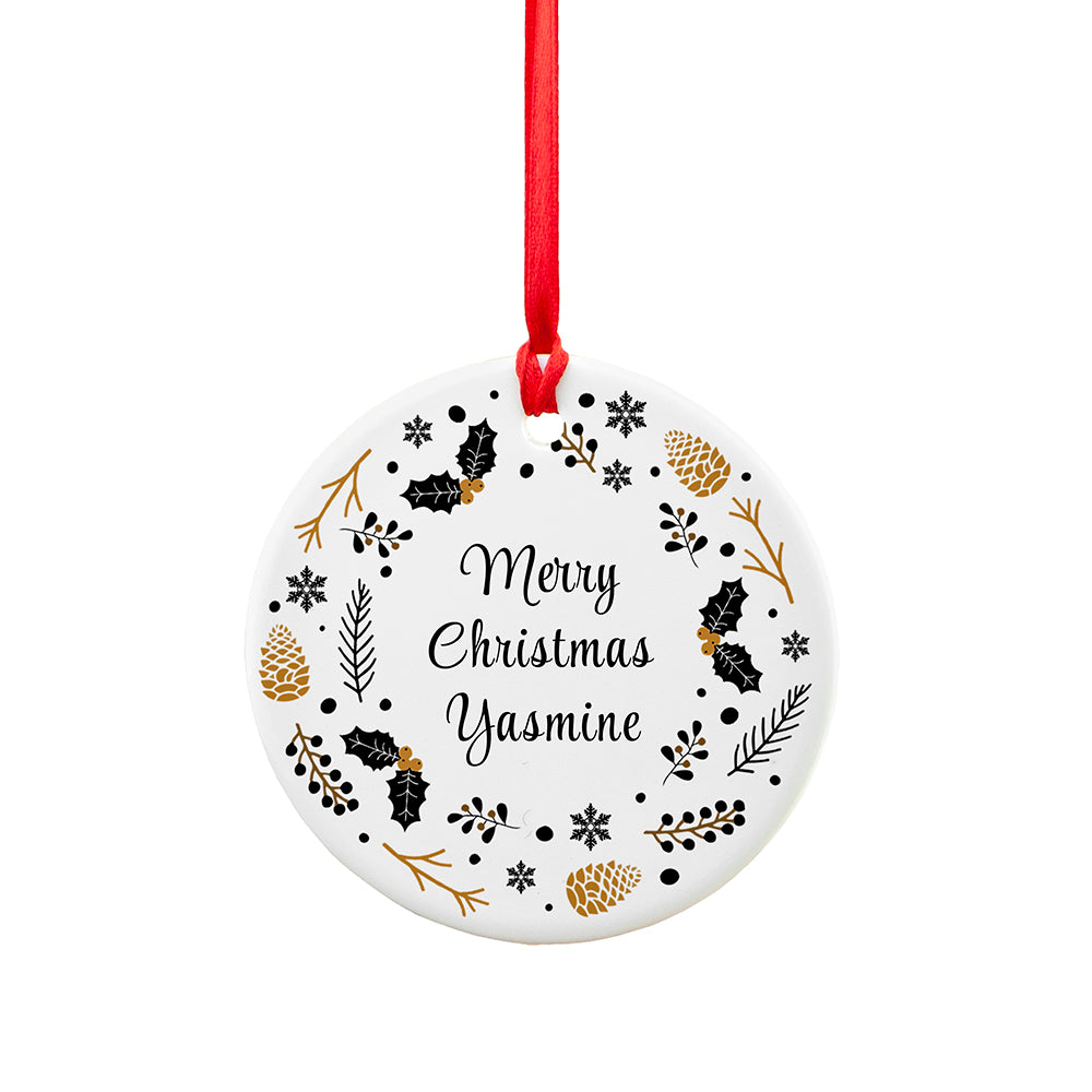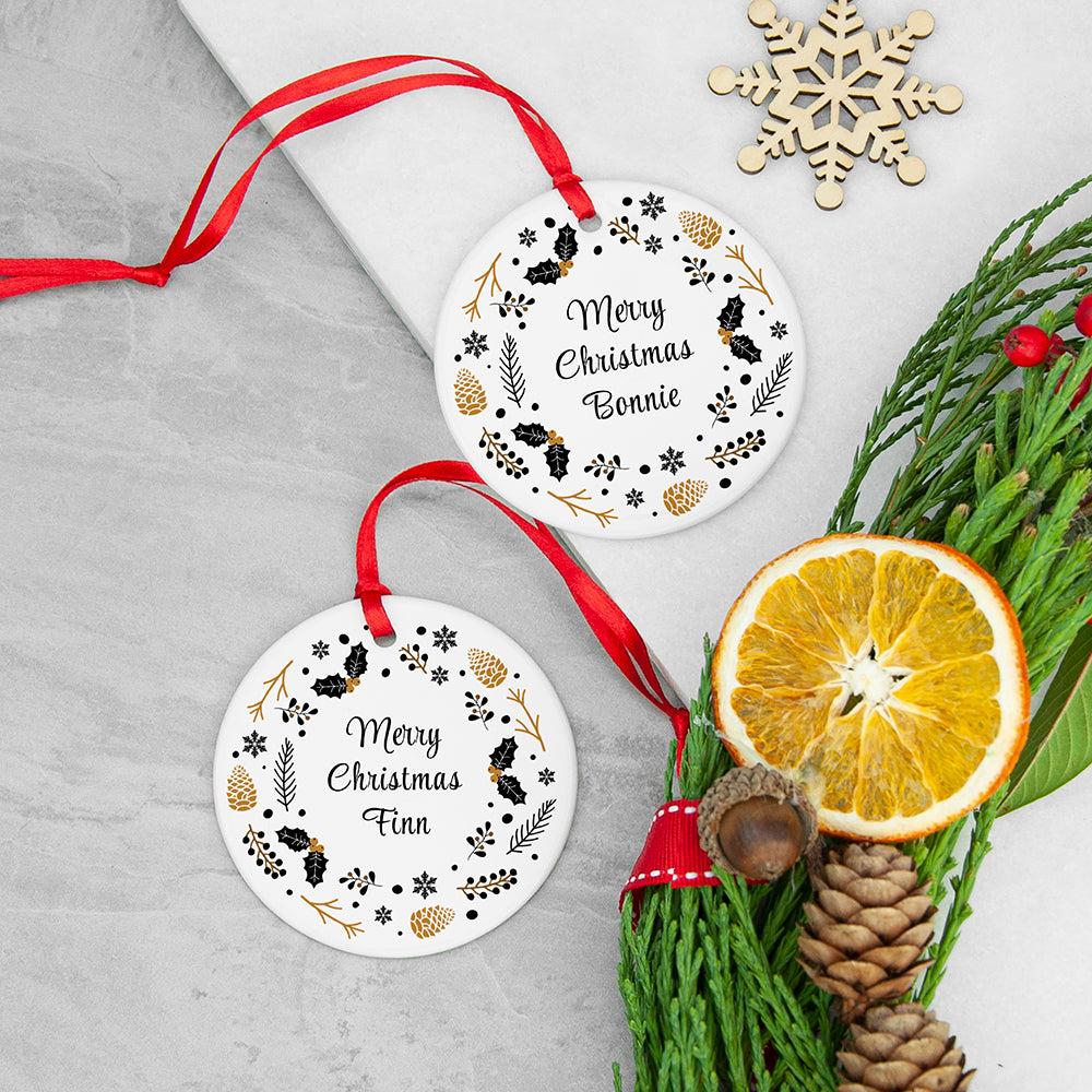 ‘Merry Christmas’ comes in a black script font in the centre of the ornament with your personalisation underneath. This is encircled by a nordic Christmassy floral design featuring beautiful acorns and holy leaves. This simple yet elegant design is sure to complement any Christmas tree.