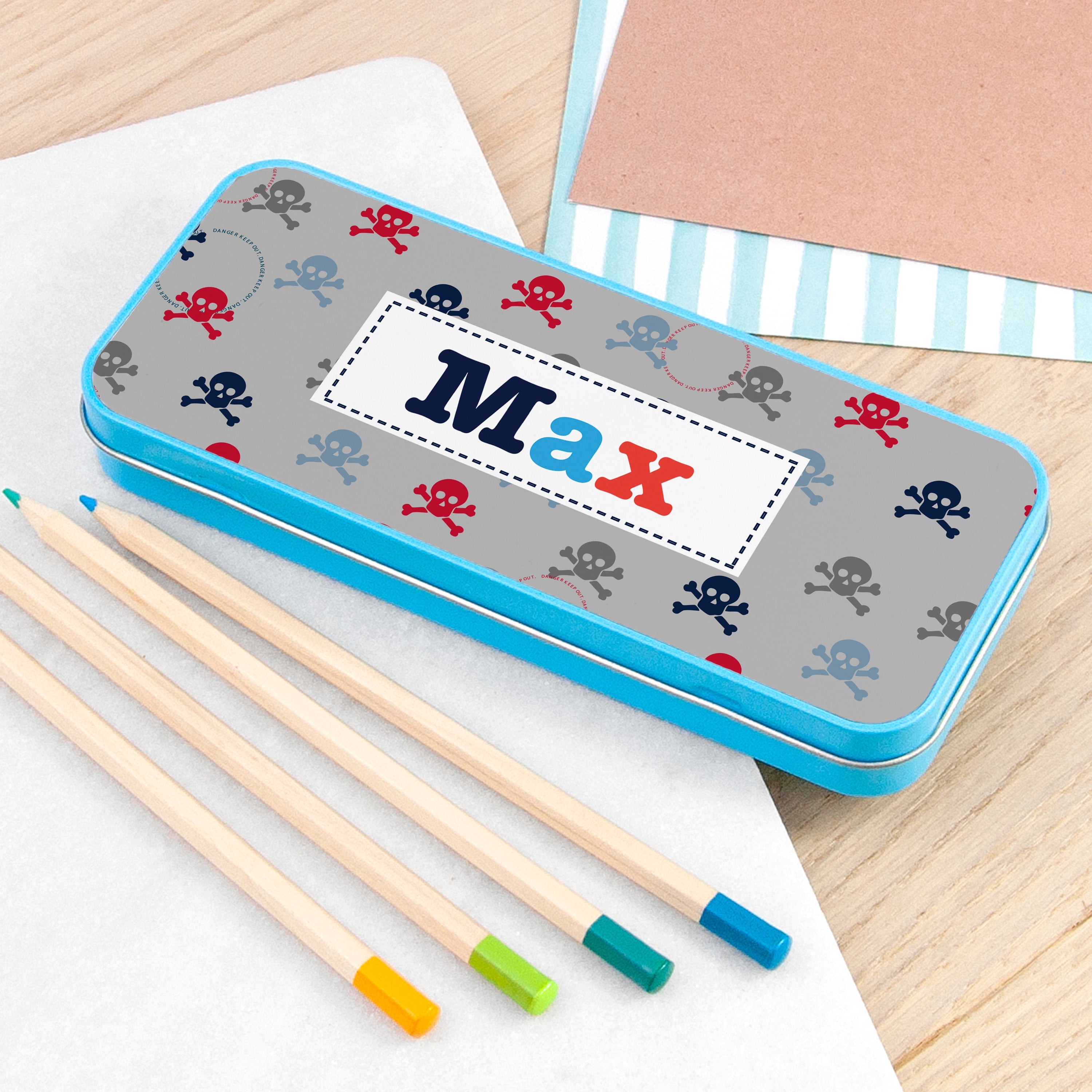 Choose one of three amazing designs for his pencil case tin: white with stars, skulls or transport.