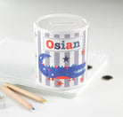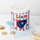 Saving money has never been this exciting! With our sleek personalised boy’s money box, he'll learn the importance of managing his money while enjoying the process with this stylish piggy bank. It's an educational journey wrapped in a fun package. With its sturdy ceramic construction, our ultra-cute money box will be a safe haven for his money, keeping it secure until he's ready to spend it.