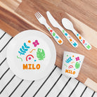 Your personalised kids colourful shapes dining set contains a stunning cup, plate, knife, fork and spoon. Every piece in your amazing dining set is designed to be safe and easy for kids to use for that added peace of mind. For example, the plate has a raised lip to reduce spillage and is made from plastic, so it won’t smash into potentially hazardous pieces - giving you that added peace of mind as your child transitions towards independent eating safely.