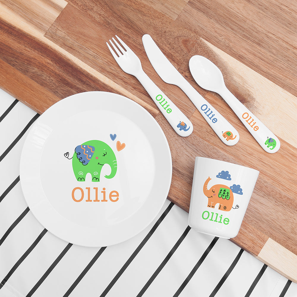 Put a smile on your little one’s face with our Personalised Children’s Elephant Dinner Set. Each set includes a plate, knife, fork, spoon, and cup, so you’ll have everything you could possibly need for everyday meals. Printed with cute and colourful elephant illustrations, this matching set is sure to brighten up your dinner table and delight any young animal lover!