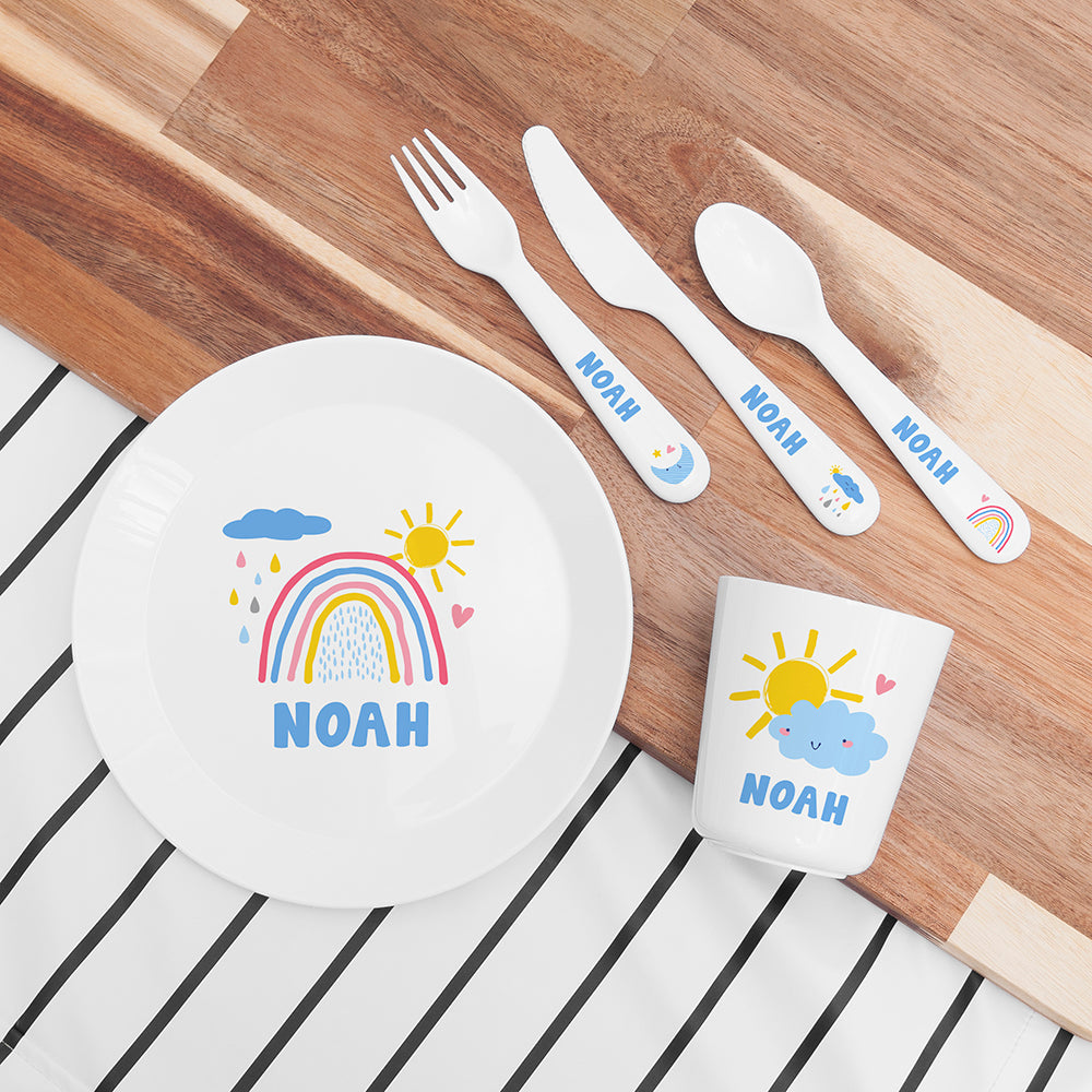 Your personalised kids pastel sky dining set contains a stunning cup, plate, knife, fork and spoon. Every piece in your amazing dining set is designed to be safe and easy for kids to use for that added peace of mind. What's more, every item will come decorated with its own standout pastel sky design which your child is bound to love, along with their name, which will be placed in a prominent position in each item in the set - everyone needs to know it's theirs after all!