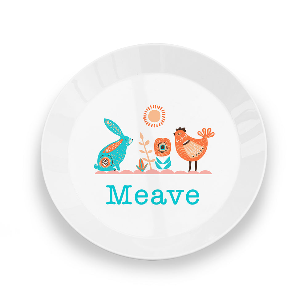 Their personalised kids scandi summer themed plate will come with an amazing countryscape background with a colourful rabbit and hen in a field of exciting and brightly coloured flowers, enjoying themselves in the sunshine, as a standard design motif.