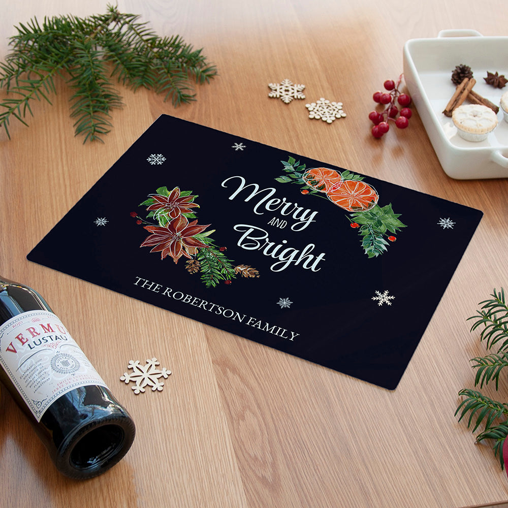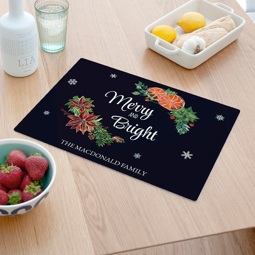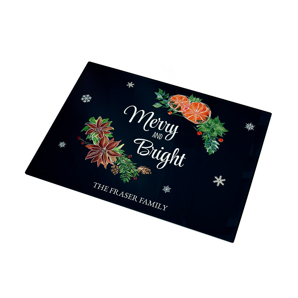 ‘Merry and Bright’ and ‘The [Surname] Family’ come as standard text with this sleek chopping board.