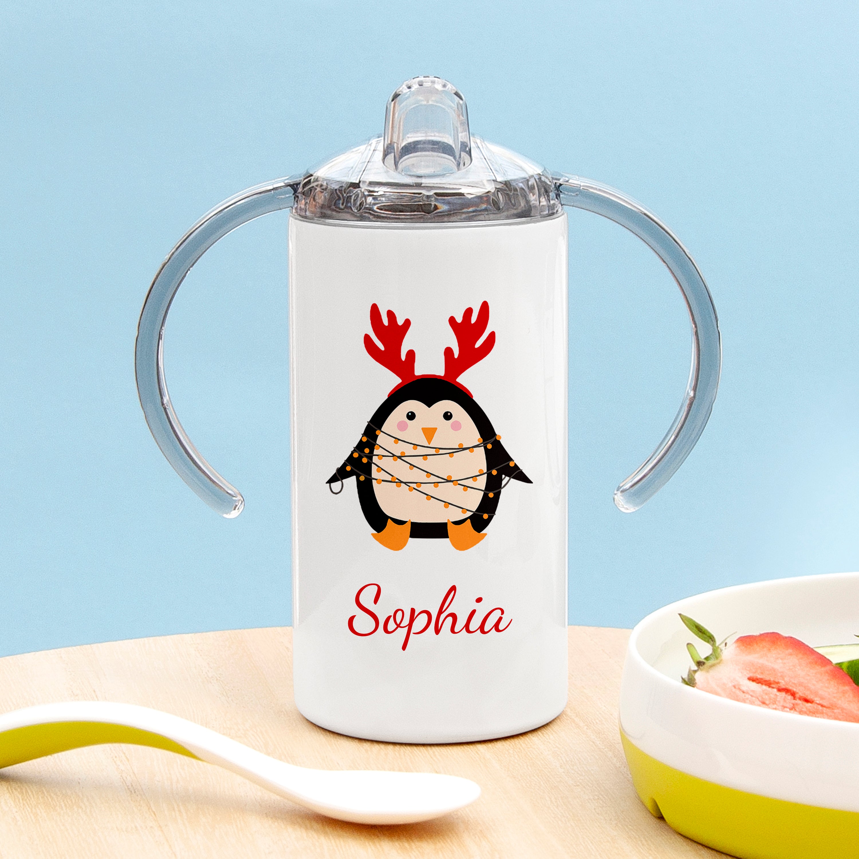 Your little ones will love this personalised Christmas penguin sippy cup! Made from stainless steel with plastic handles, it's the perfect way to keep your loved one hydrated on the go. Plus, it makes a great stocking filler or Christmas present for the little ones in your life.
