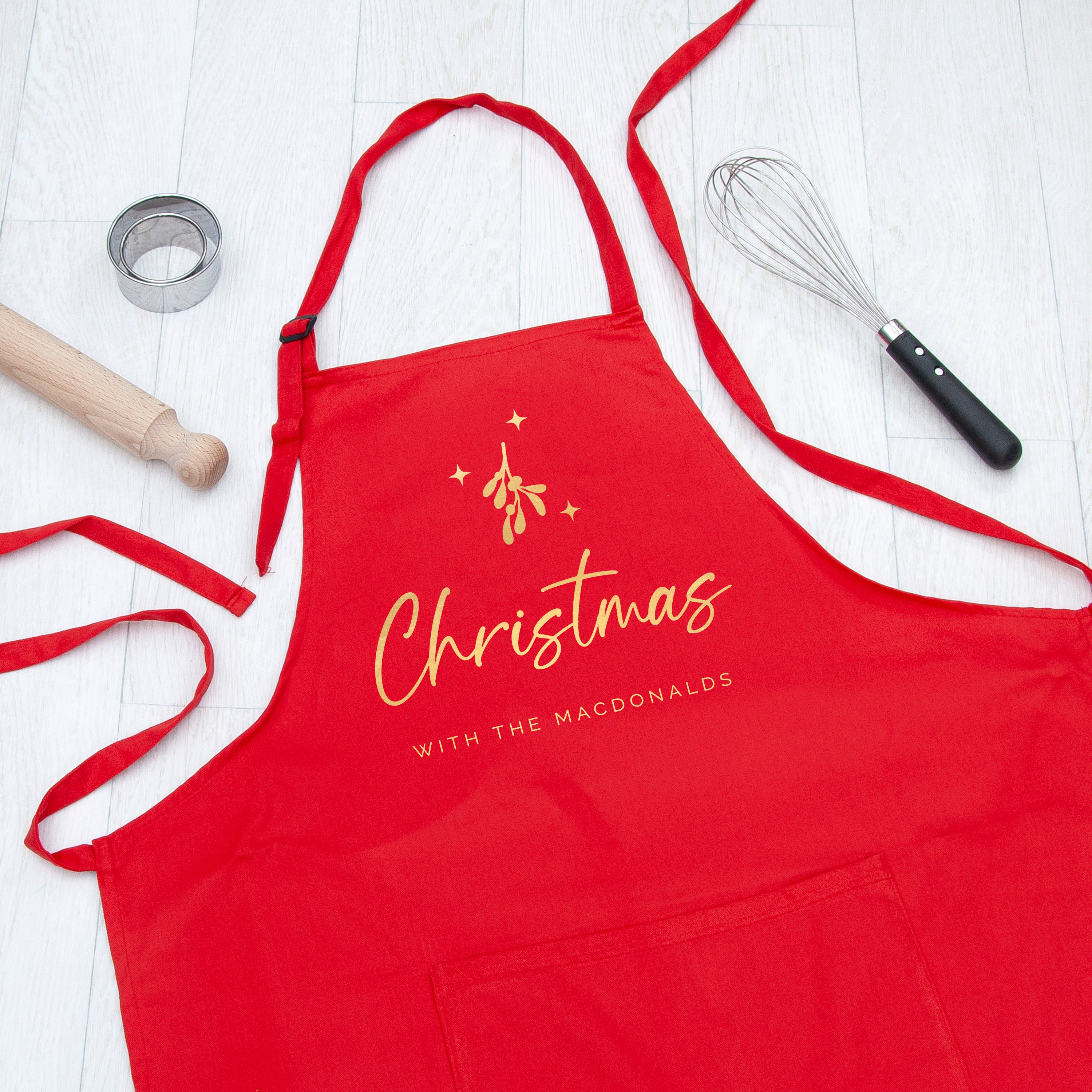 It's Christmas time, which means it's time to get the family together and get cooking! Get your loved one a stunning Personalised Christmas with the Family Apron - to help make cooking with the family more fun and festive. 'Christmas with the [Surname] family’ comes as standard black text with this gorgeous design, underneath a mistletoe icon and some shining stars.