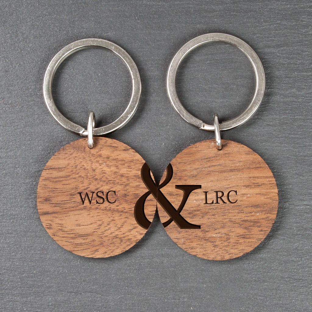 Laser cut and engraved wooden keyrings. Can be personalised with the names or initials of two people, one for each keyring.