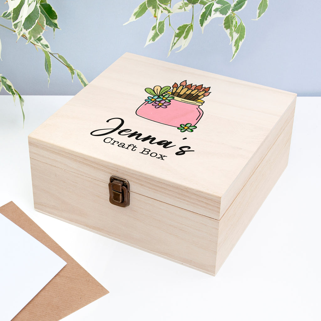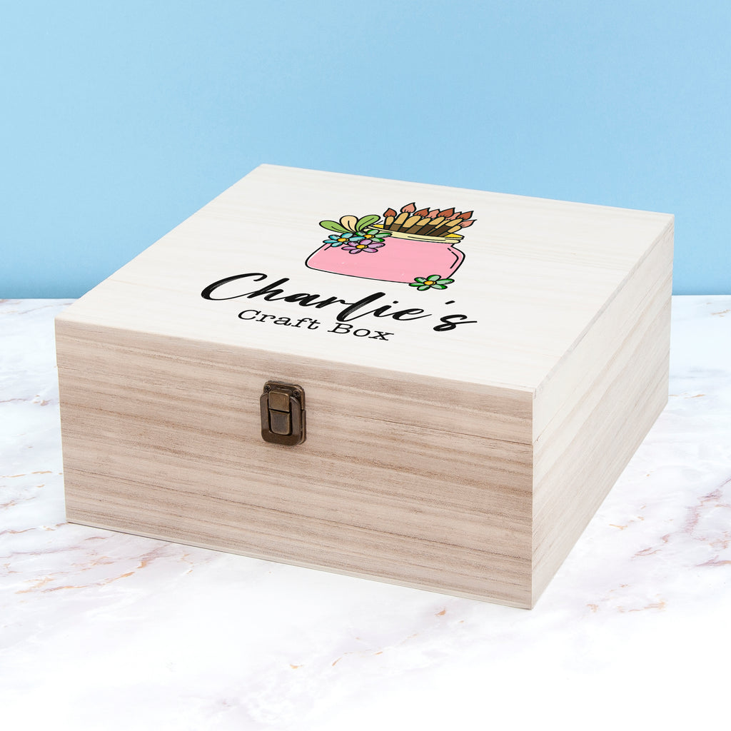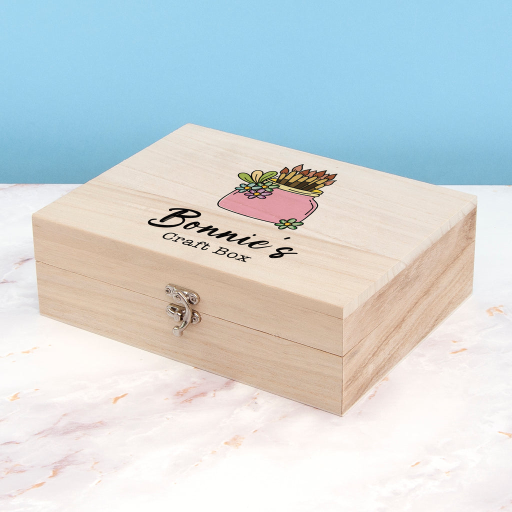This sensational craft box features a cute image of a pink pot with flowers on it, full of paint brush, ready to create another breathtaking work of art. ‘[Name]’s Craft Box’ comes as standard text, with your loved one’s name coming in a classy script style font.