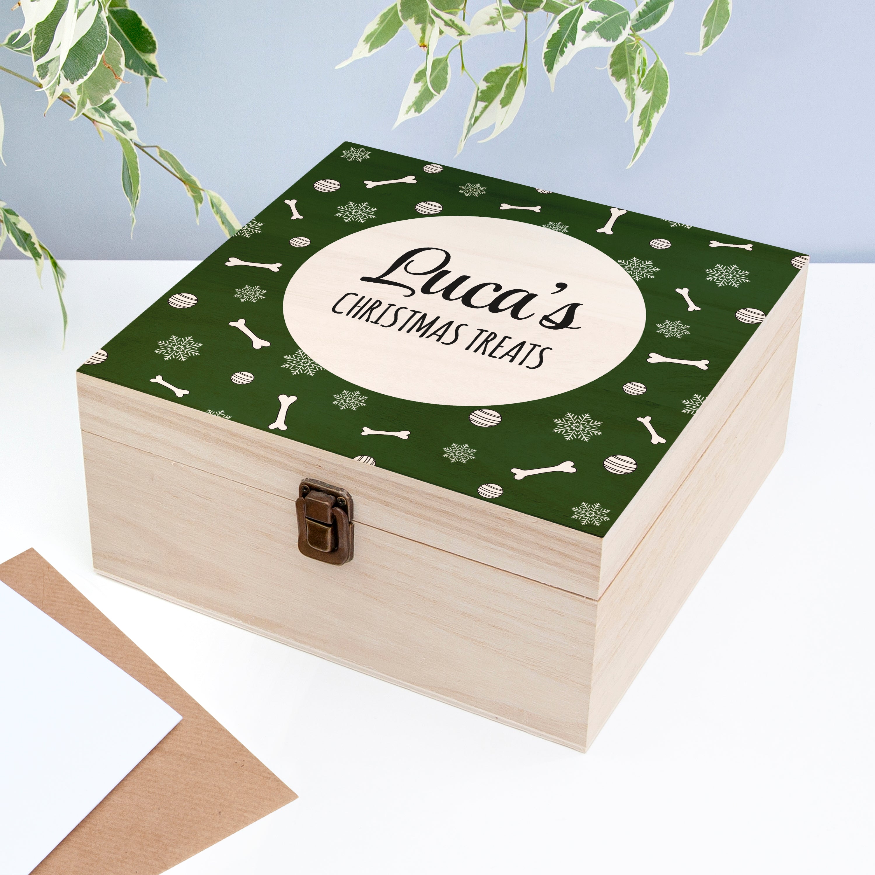 Your pet pooch’s name will be written prominently in the centre of their box in a white circle, the background will be a Christmassy green with scattered images of dog treats. Fill with your canine companion’s favourite treats!