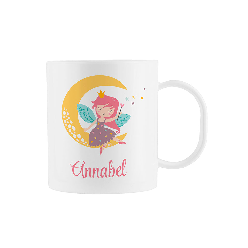 The ideal Christmassy gift for your little fairy, she’ll love our personalised fairy kids polymer mug. A beautifully crafted and hardwearing gift that can handle even the most energetic of sippers. The image depicts a magical fairy sitting on a crescent moon. Your loved one’s name will appear in a pink script font underneath.