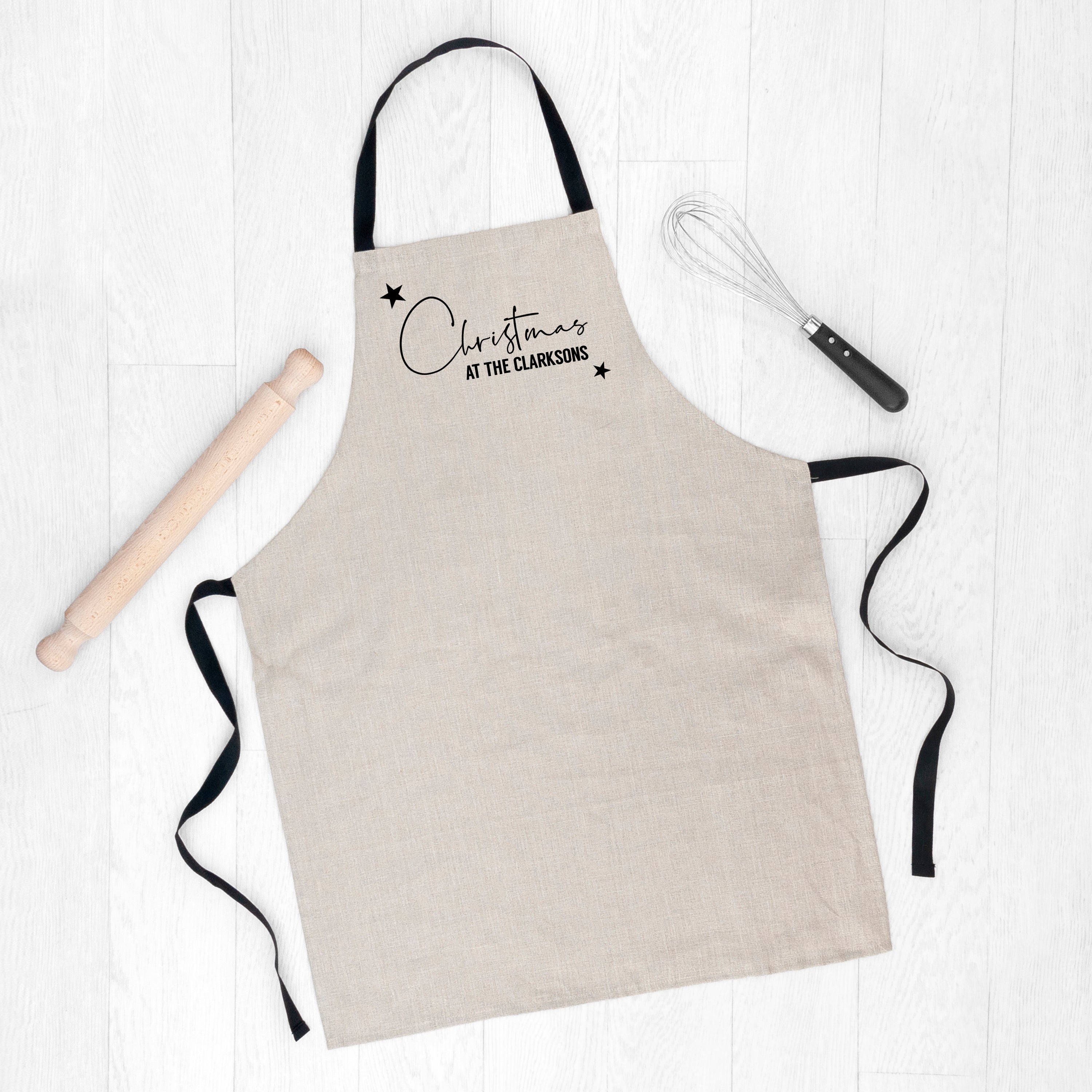 ‘Christmas at the [Surname]s’ comes as standard text in black. ‘Christmas’ will be written in a Christmassy black script font as standard with rest written in block black capital letters. The design is topped by two gorgeous stars. The neck strap and waist tie are black, while the main body of the apron is a natural beige.