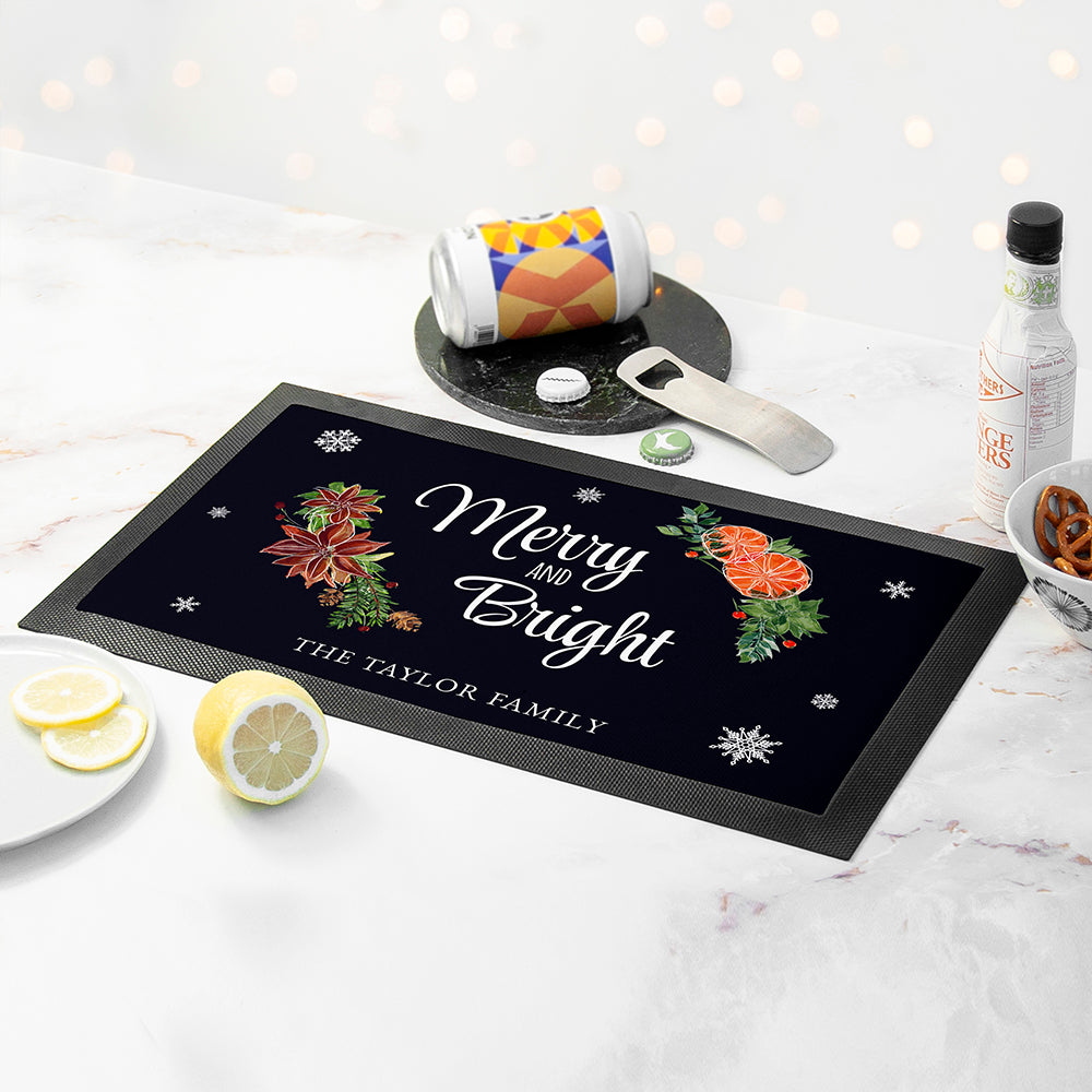 The perfect addition to any home bar this holiday season, our gorgeous personalised floral bar mat is ! This festive bar mat features a stunning Christmas floral design and will add a touch of holiday cheer to your home. Made from rubber, this sleek bar mat is durable and is perfect for protecting your countertops from spills and drips, and will also help to keep glasses and bottles in place.