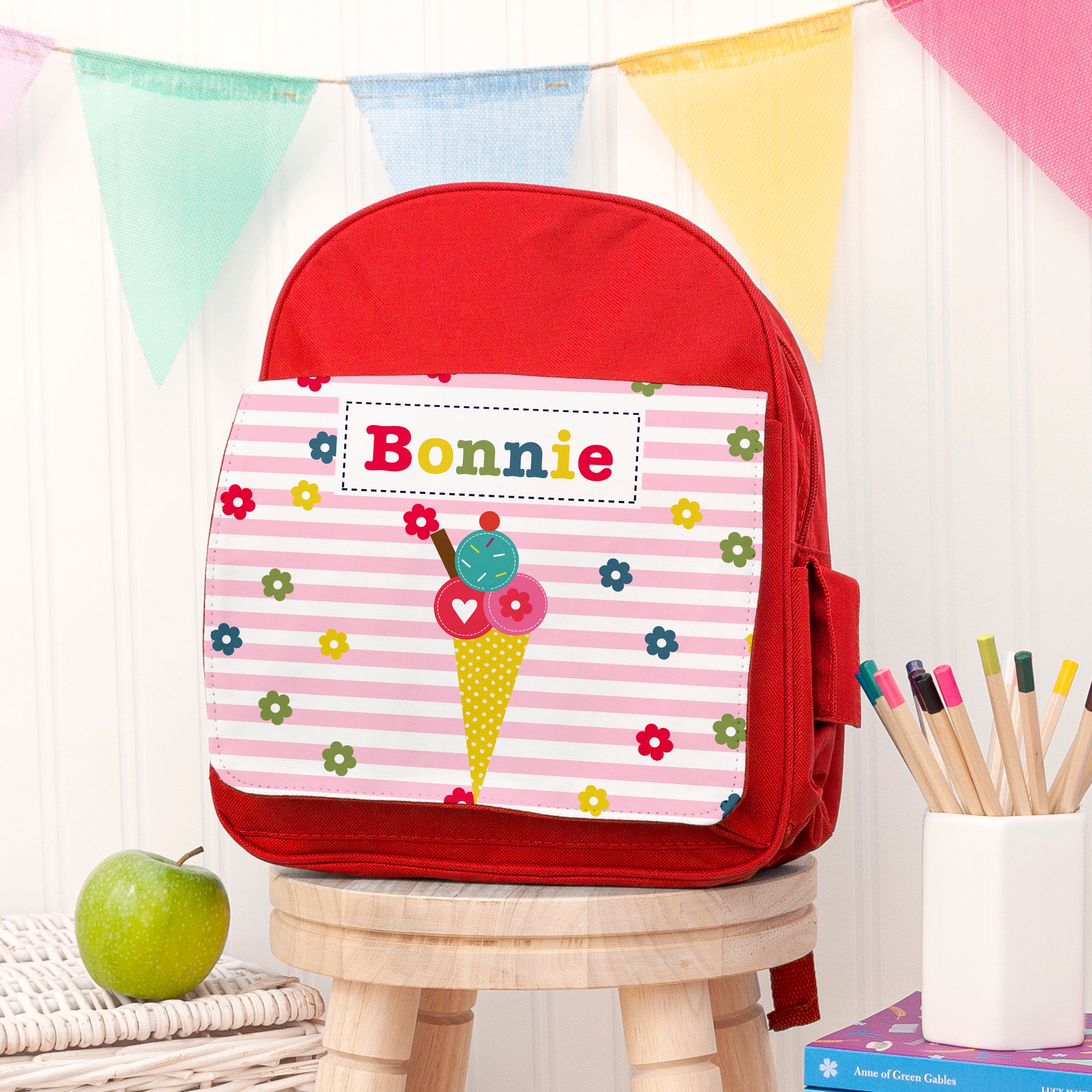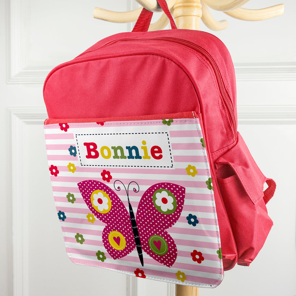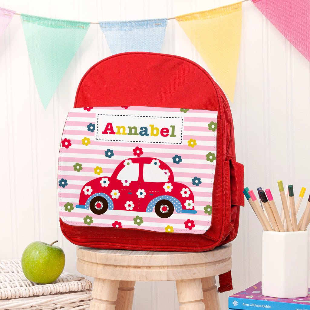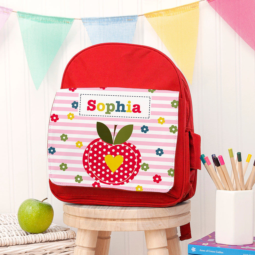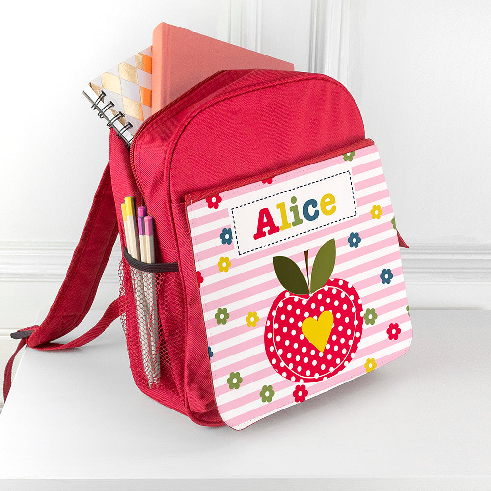 Our stylish and practical personalised girl's red mini rucksack will be the perfect companion to her school adventures. The ultimate new school, back-to-school or birthday gift for her! Whilst it's not too big and bulky, it's still the ideal size for all her school essentials, like books, stationary, space clothes or PE kits.