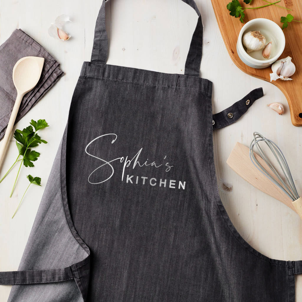 ‘[Name]’s Kitchen’ will come as standard text with this apron. Your loved one’s name will appear in a script style font whilst ‘kitchen’ will be written in capitals.
