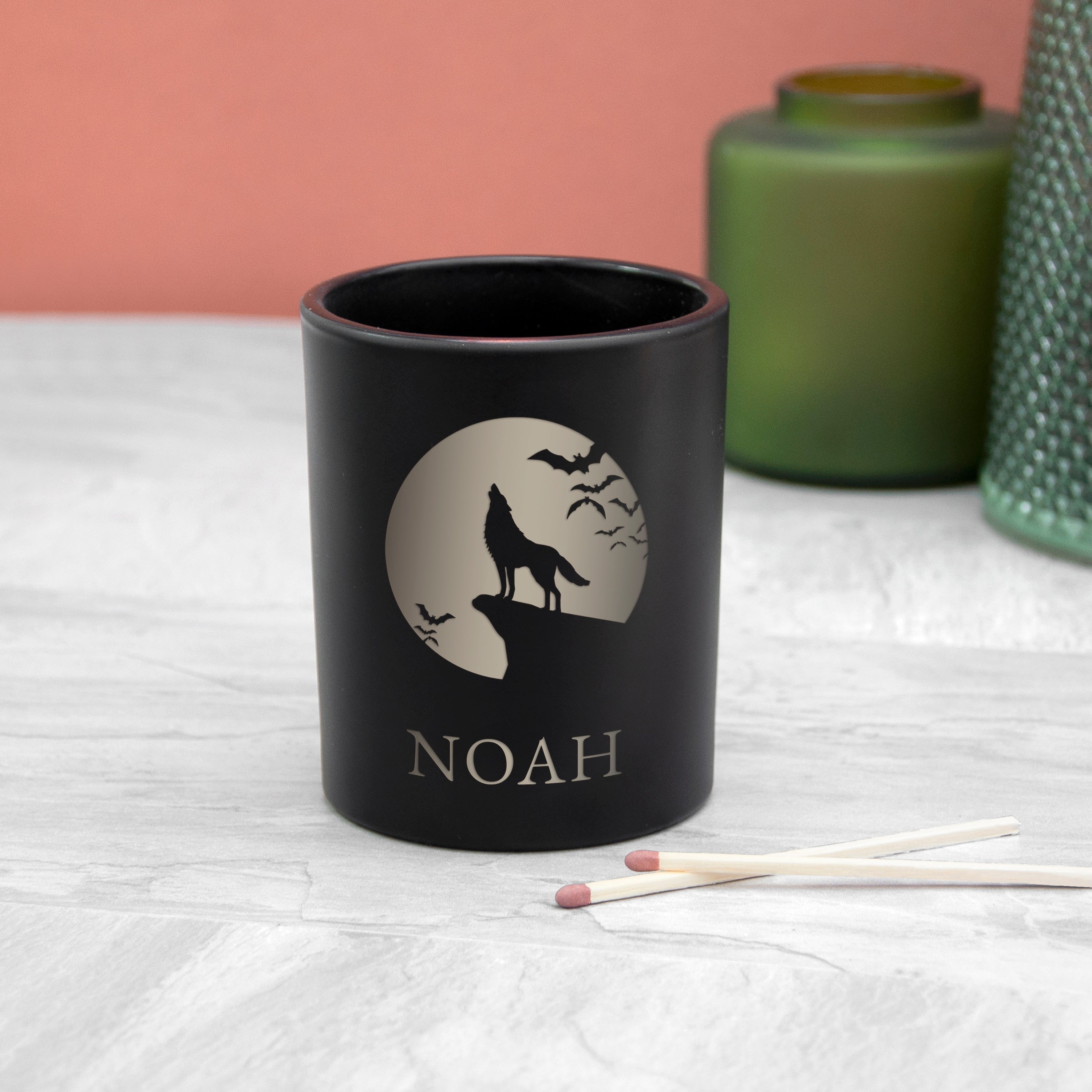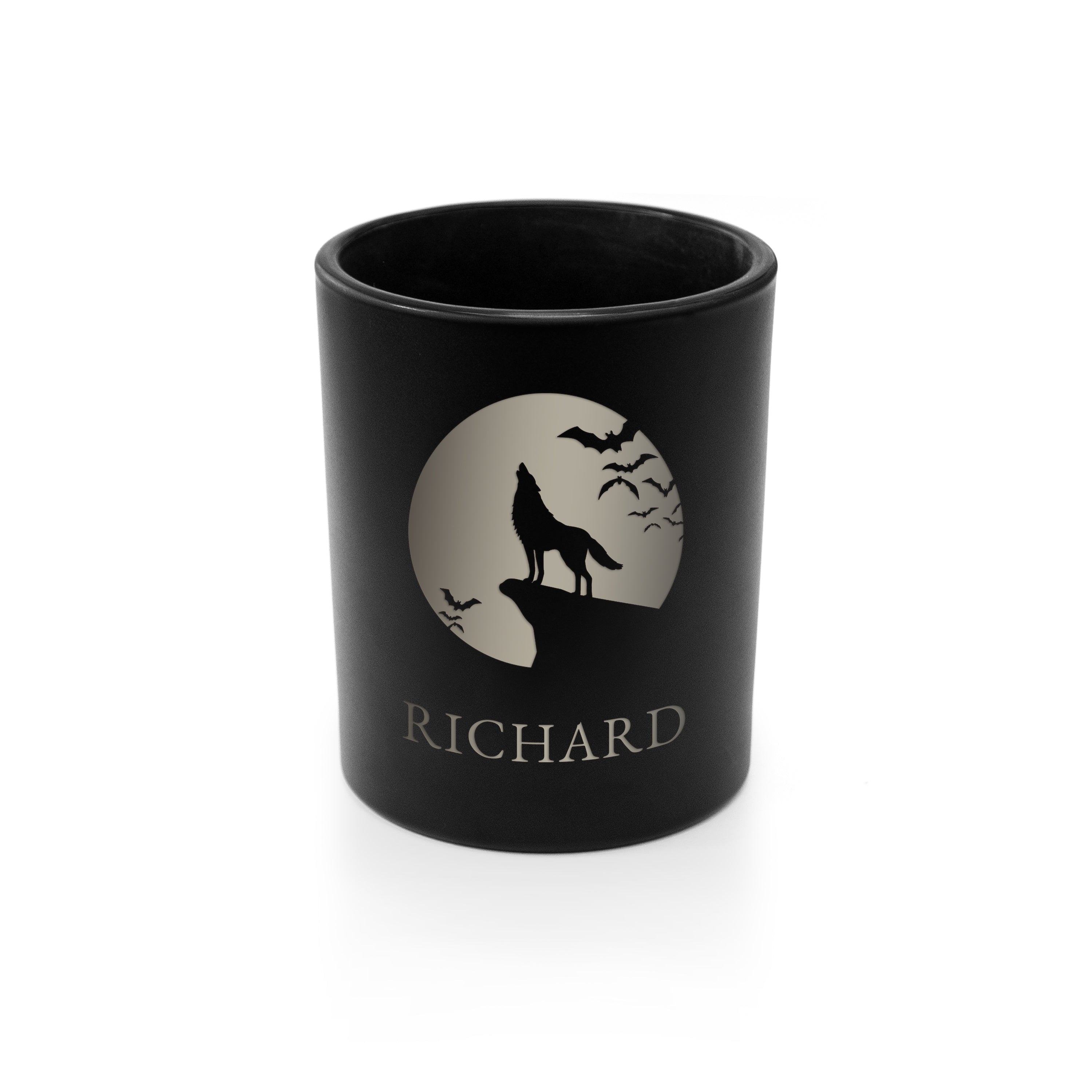 This sleek black candle holder features a sinister wolf howling during a full moon with your loved one’s name engraved underneath.