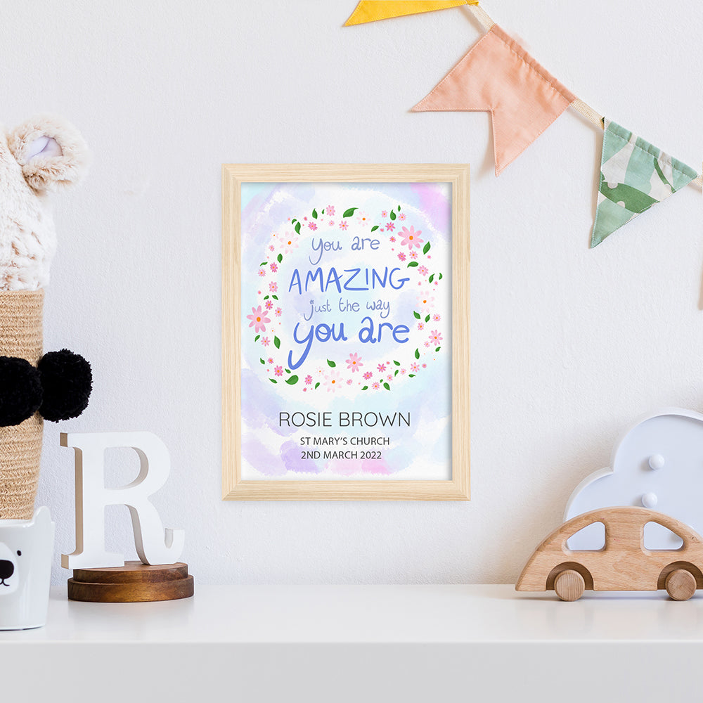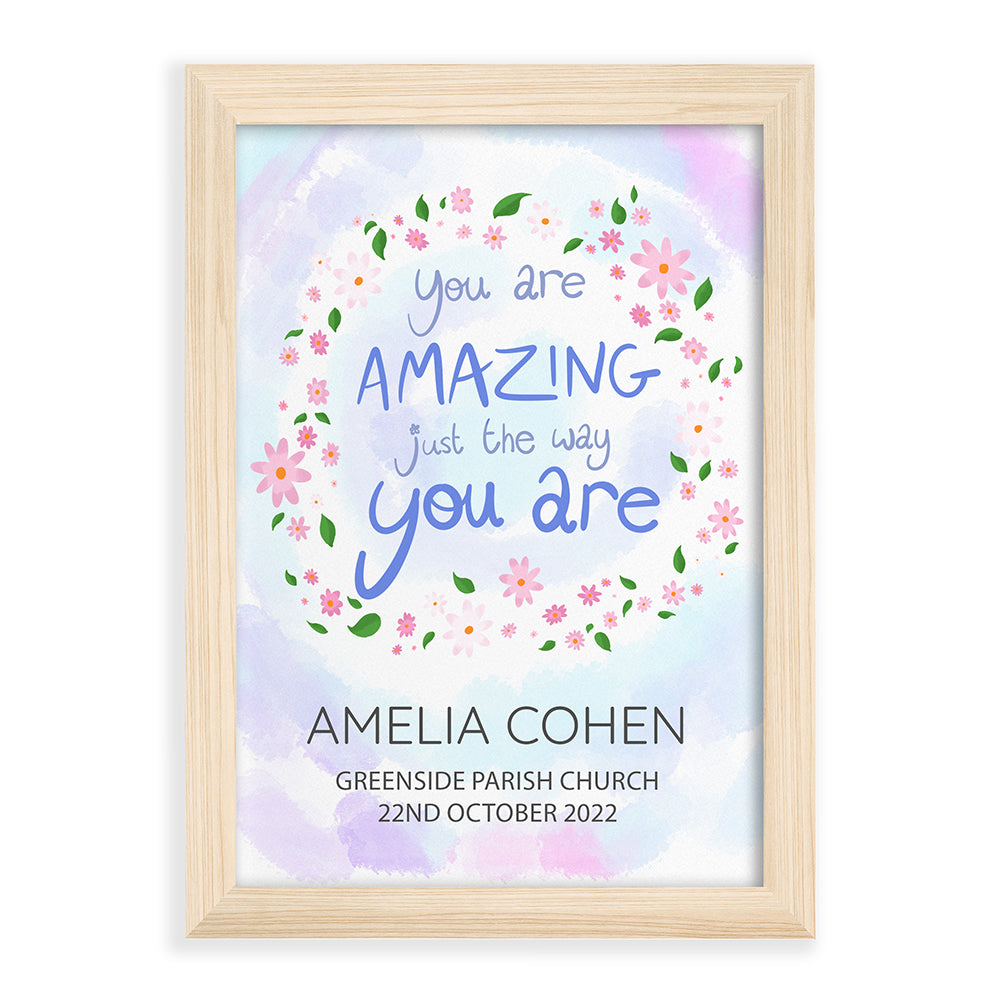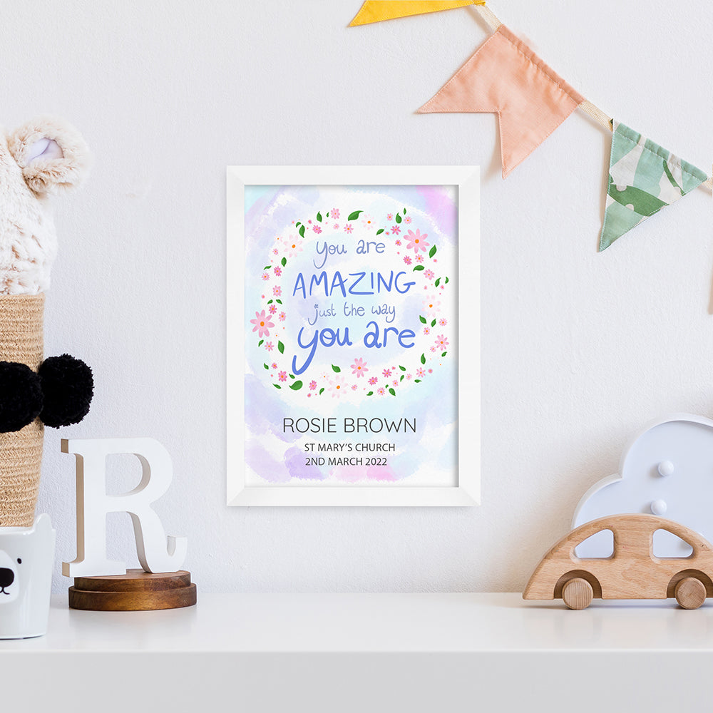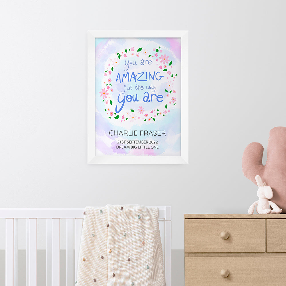 The inspirational phrase ‘you are amazing just the way you are’ comes as standard text for this wall print, and comes encircled by a floral arrangement on a pastel blue and purple daytime sky background. For a personal touch, your personalisation will be placed below the floral focal point, with their name written above the message in a slightly larger black font.