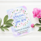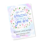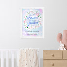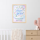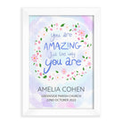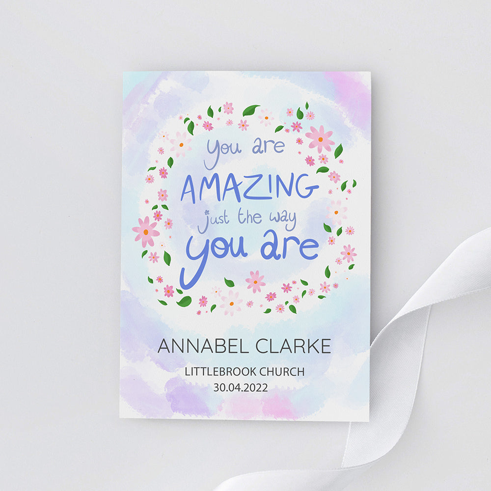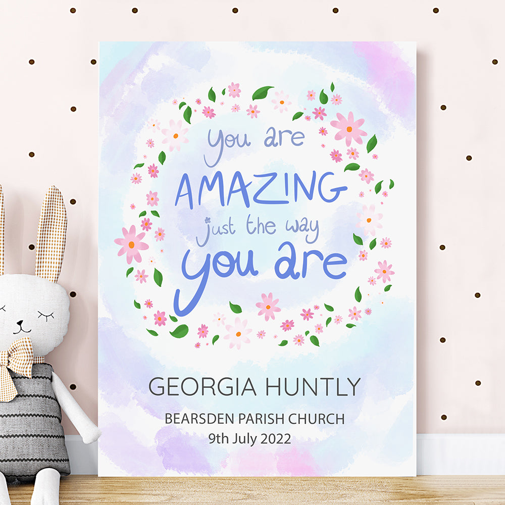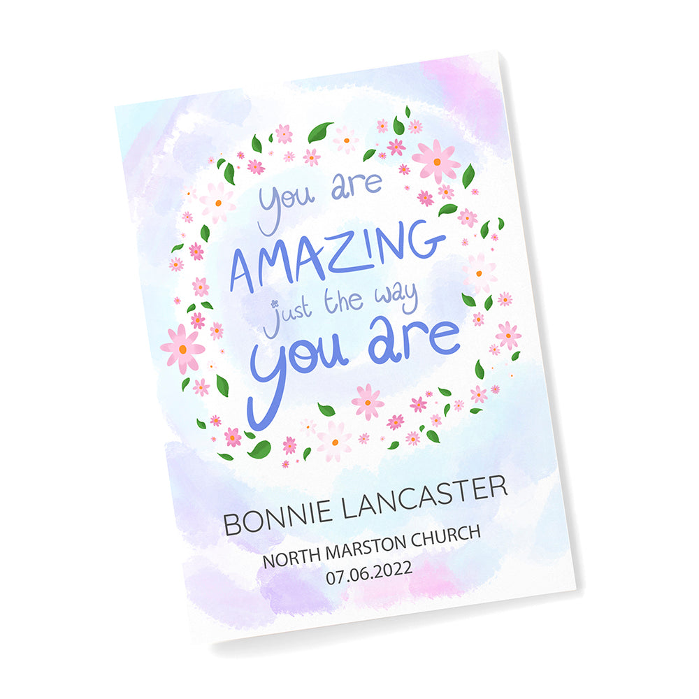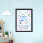 The inspirational phrase ‘you are amazing just the way you are’ comes as standard text for this wall print, and comes encircled by a floral arrangement on a pastel blue and purple daytime sky background. For a personal touch, your personalisation will be placed below the floral focal point, with their name written above the message in a slightly larger black font.