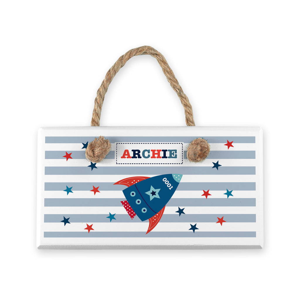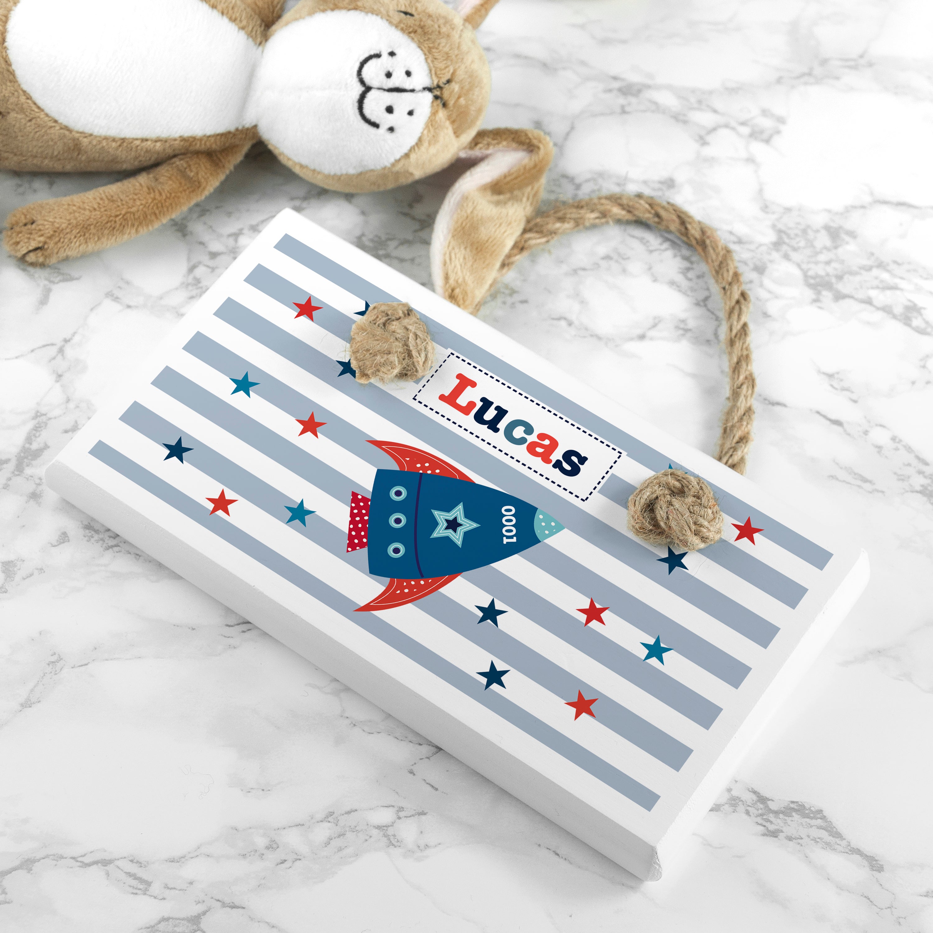 This stunning wooden hanging sign features some hanging rope so it can be hung up on your little one’s bedroom door. The design contains a colourful space rocket in the centre on a starry striped background - your little one’s name will be written in colourful letters for all to see.