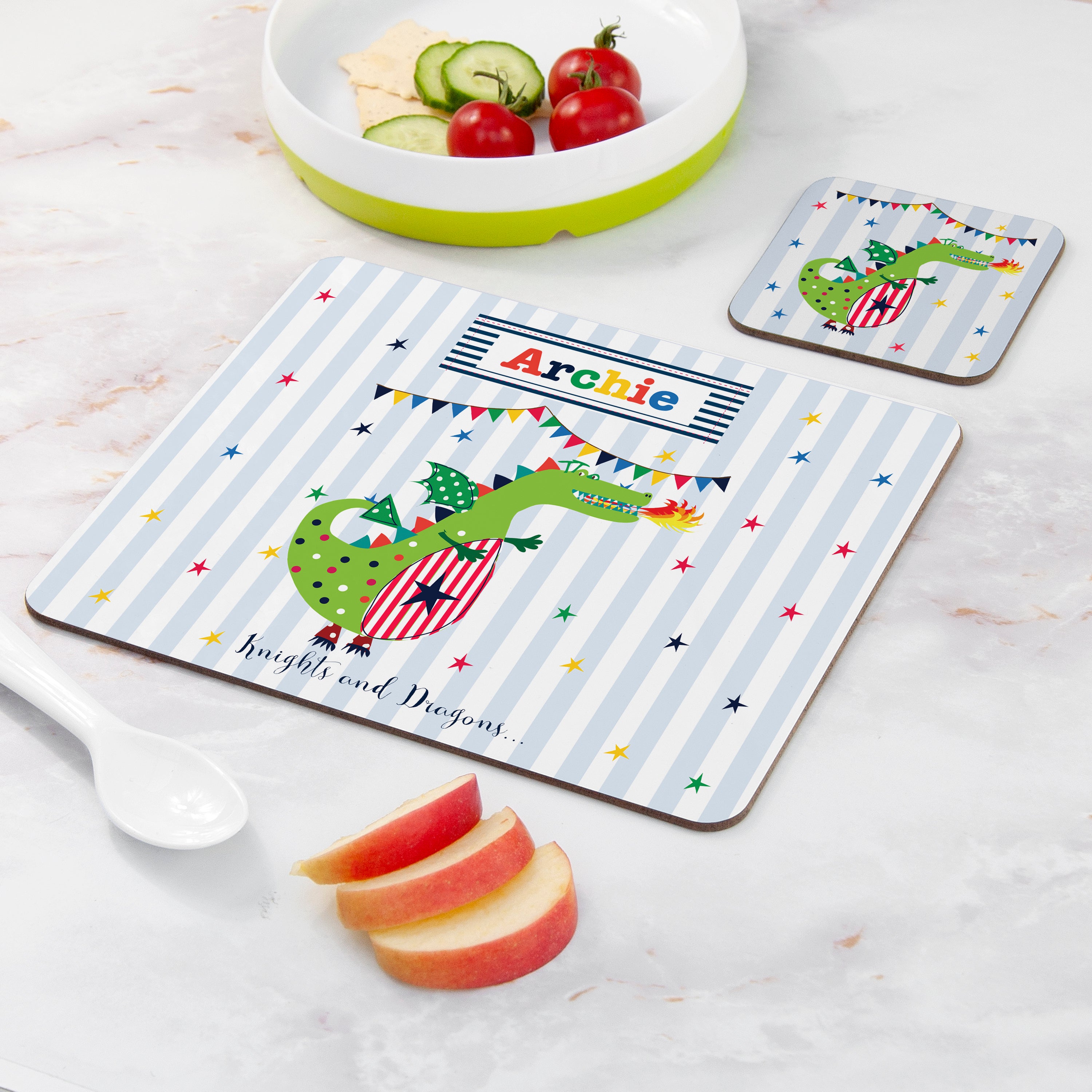 This fantastic placemat set contains a fun coaster and placemat. Both will feature a super cute happy looking fire breathing dragon under some bunting. This will be placed on a light blue striped background with colourful stars, which add to the mystical magic of the design. 'Knights and Dragons...' comes as standard text in a beautiful blue script style font.