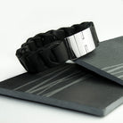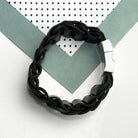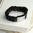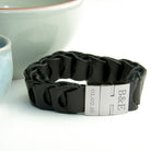 This large statement leather bracelet in stylish black can be personalised in two ways, with a date on the left of the clasp and up to three initials on the right of the clasp. The bracelet is made from treated, hard-wearing woven leather and has a distinctive clasp for added security as well being easy to wear.