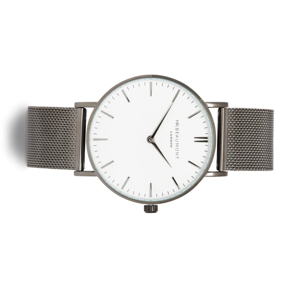 Mr Beaumont watches are modern in design but with classic, timeless touches - making them a gift that will stand the test of time. Made from stainless steel and with a large 41mm dial with metallic silver details this stunning personalised men’s metallic charcoal grey watch will certainly make a statement.
