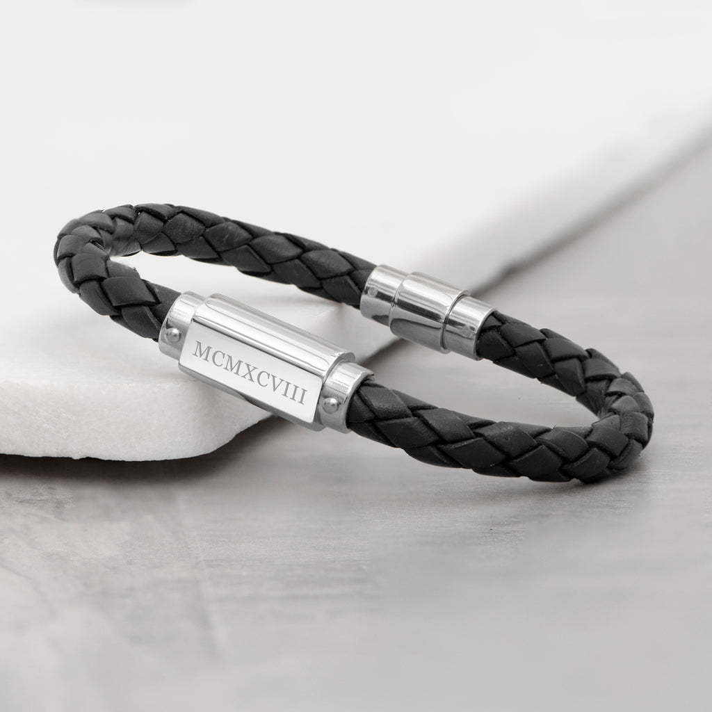 Personalised Men's Roman Numerals Luxury Black Leather Bracelet