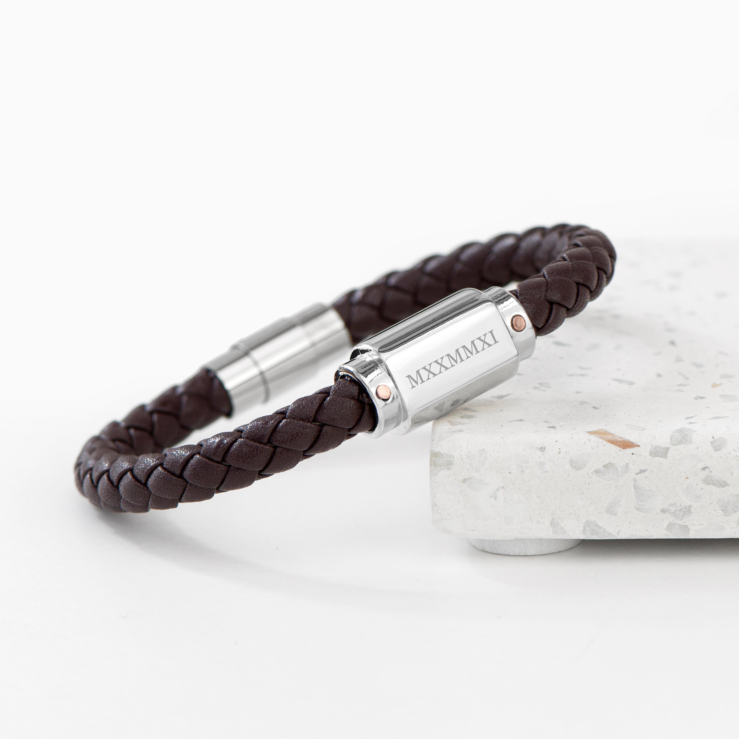 Personalised Men's Roman Numerals Luxury Brown Leather Bracelet