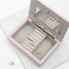 This gorgeous personalised blush pink and silver jewellery box will keep your memories alive. With a luxury nude suede feel interior, and mirror situated on the reverse of the lid. The jewellery box has lots of space for all her favourite rings, trinkets and accessories, whilst the super soft suede interior will help keep jewellery scratch free.