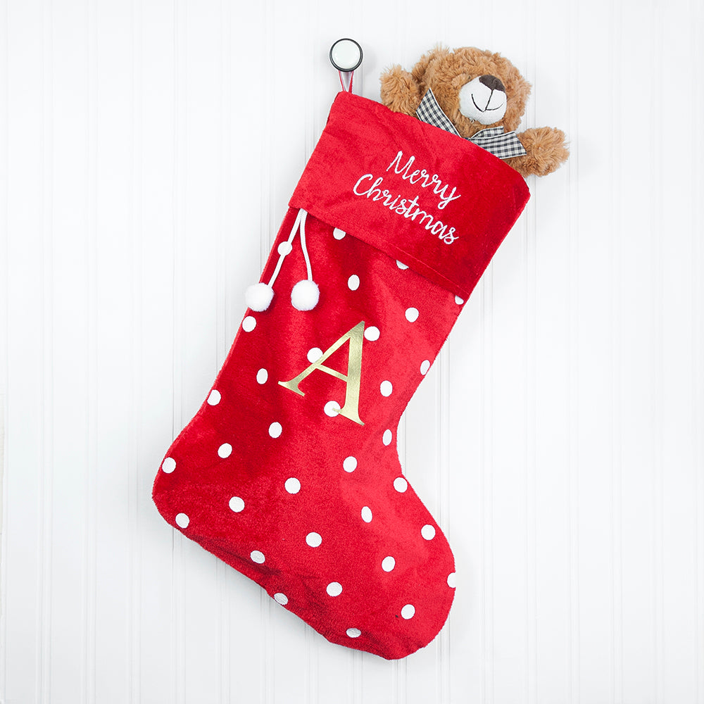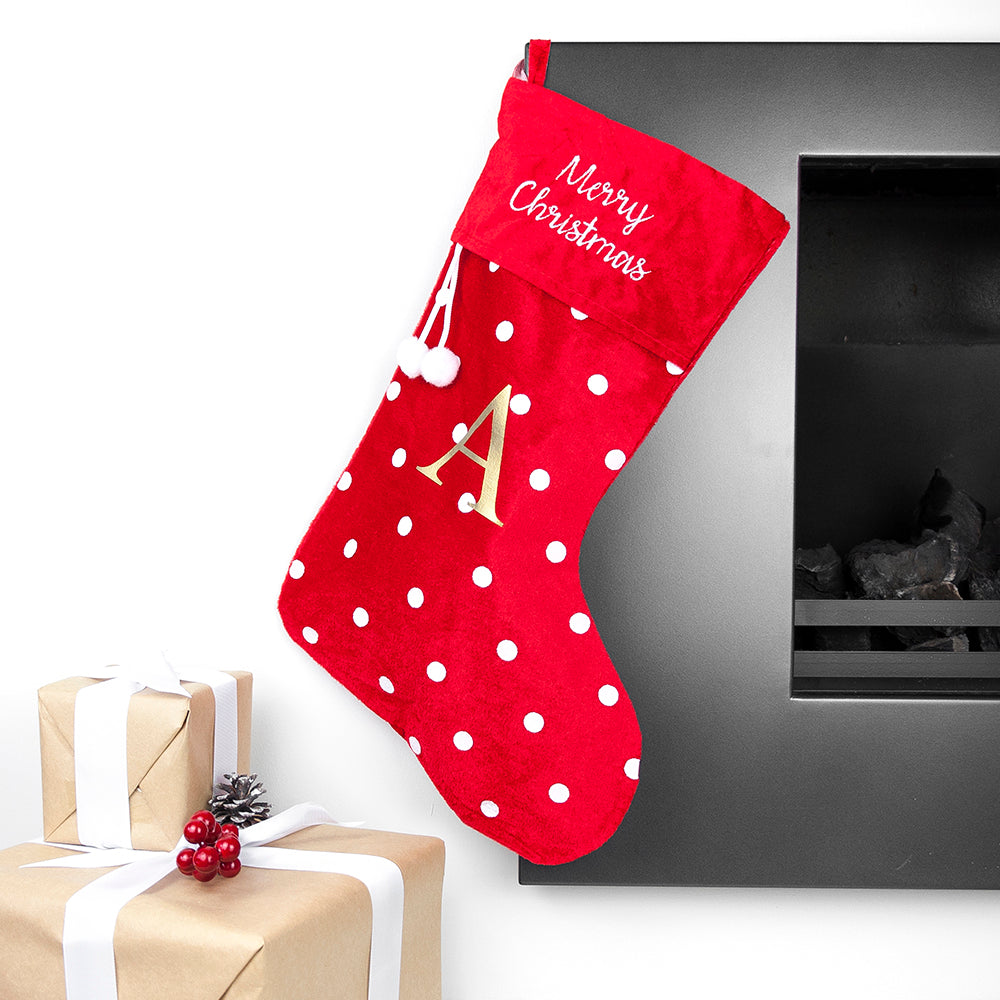 The stocking can be personalised with an initial, which will sit on the red velvet trimming.