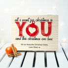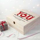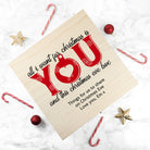The words 'all I want for Christmas is you' and 'and this Christmas Eve Box' comes as standard text with this wonderfully romantic design. 'You' will be written in the a large Christmassy red font with the O doubling as a bauble and heart to show the undying love you have for each other. Your message will be printed will be printed underneath to the highest standard by our fantastic team of personalisation specialists.