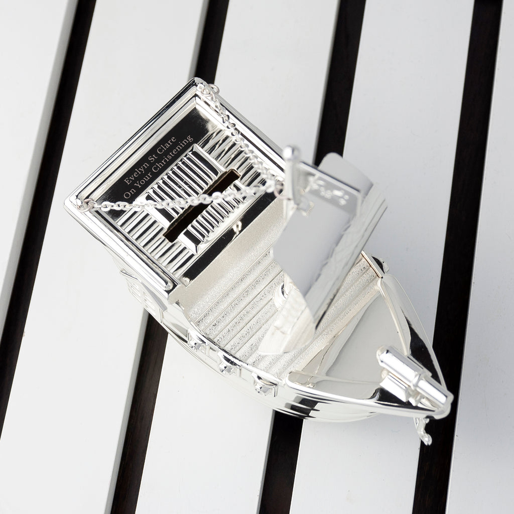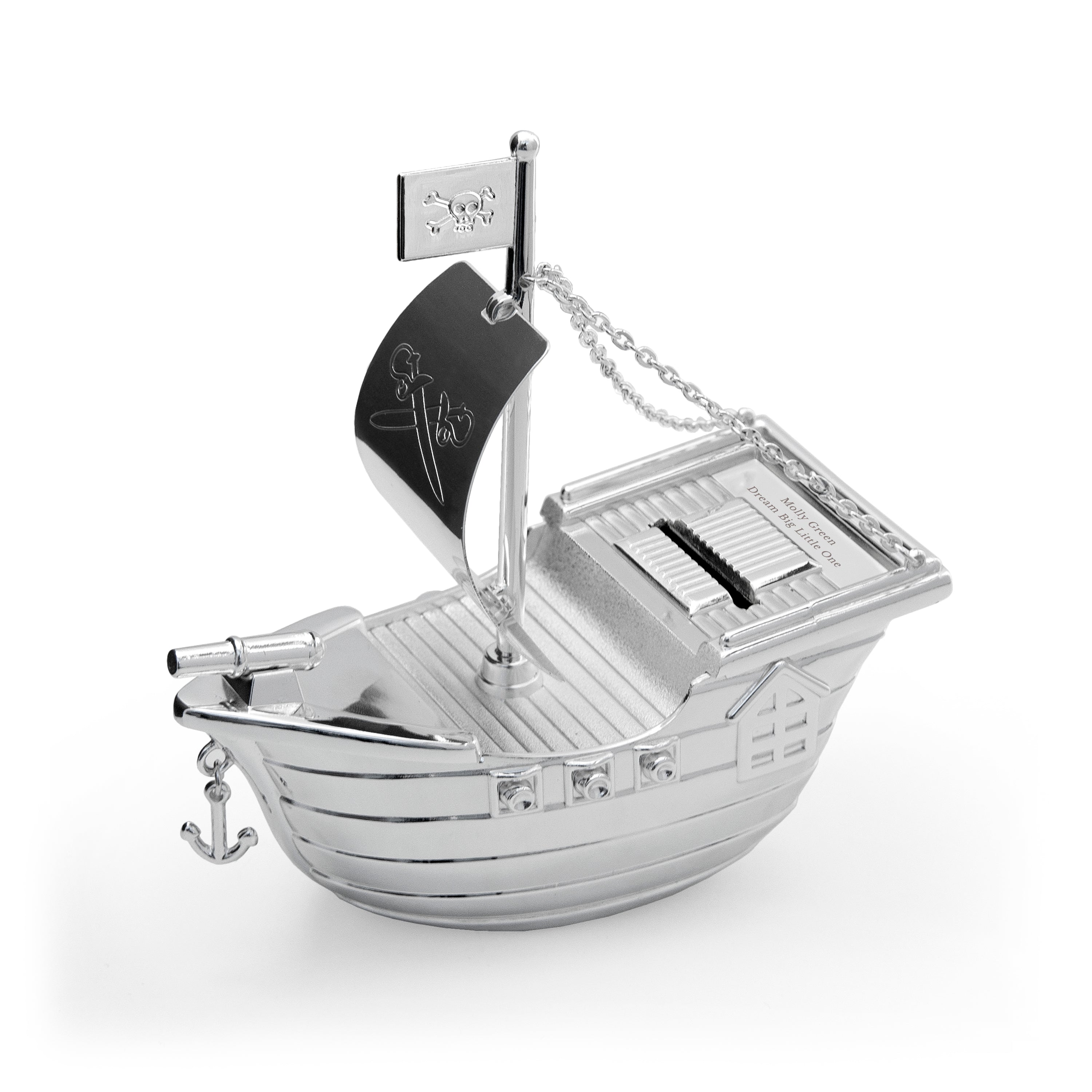 Ahoy there! Give your special little pirate a treasure that will last a lifetime: our super cute Personalised Silver Plated Pirate Ship Money Box. The perfect gift for a special occasion such as your little one’s first birthday, their baby shower and Christening. This premium quality money box is shaped like an awesome pirate ship, and features a place to insert coins or notes - perfect for helping your little one to learn the value of money.