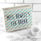 Name on the outside of the box can be personalised with up to 30 characters and will be followed by "[Teacher's Name]'s Tea Break" as standard to show it's theirs and how much they mean to you. Behind their personalised name will be a gorgeous light blue diagonal striped background pattern as standard.