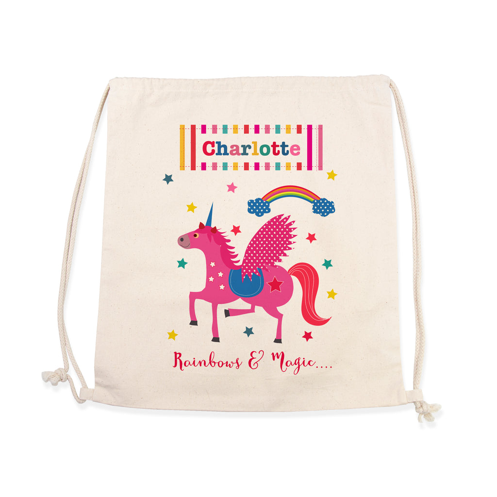 The personalisation adds to the magic for this bag, making each gift unique.It's like having their very own portal to a mystical land, personalised just for them by our team of artisan creatives! Unleash the magic and bring a smile to their face with this super cute unicorn nursery PE kit or book bag.