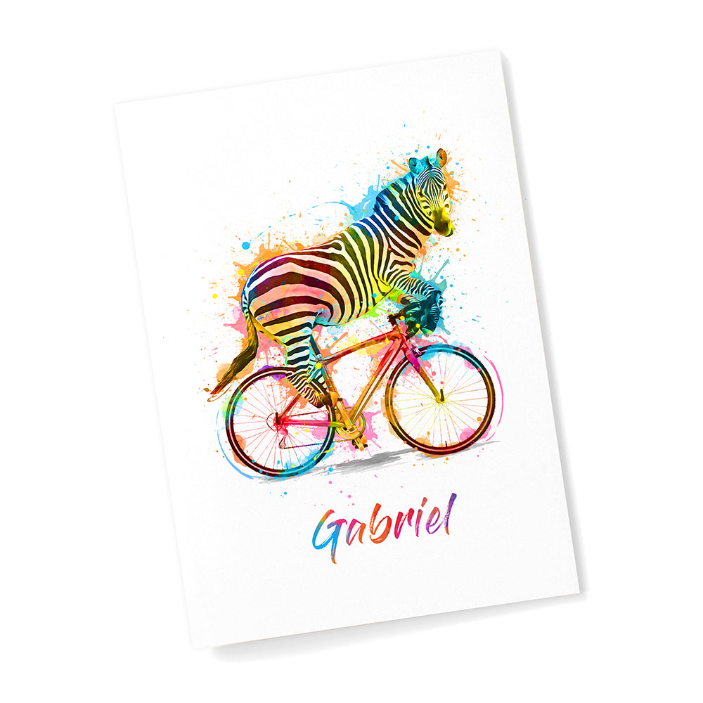 The watercolour image is of a zebra joyfully riding a bike…because of course it is! Your loved one’s name will be placed underneath this image as standard in a similarly vibrant watercolour hue in a bold and funky font.