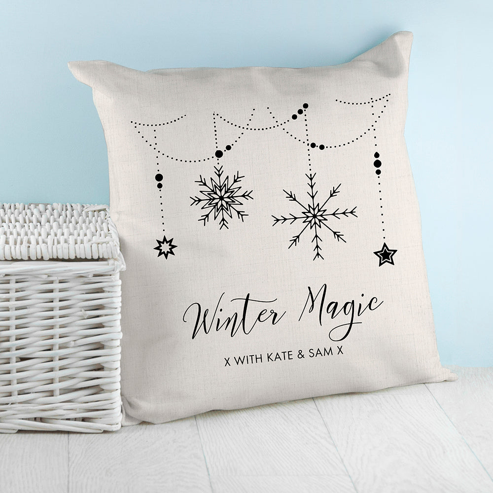 The cushion cover is made of linen and features a beautiful snowflake design that is sure to bring a smile to any face - ‘Winter magic’ comes as standard text in a black script font.