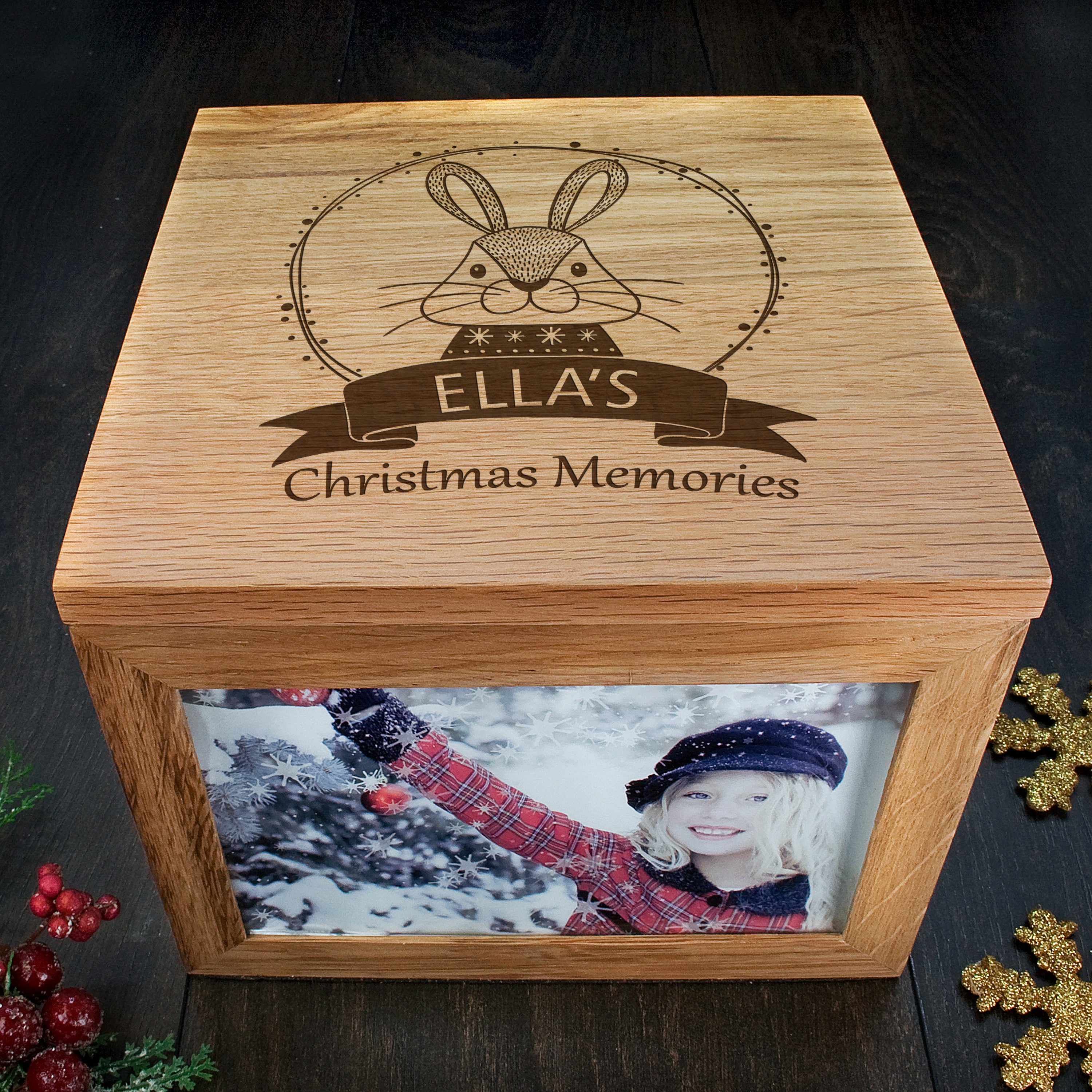 Made from solid oak this large keepsake box is the perfect gift for Christmas. With space for four large photos as well as a removable lid meaning you are able to fill this box with Christmas memories past and present. You can fill the box with cards, special ornaments and much more.