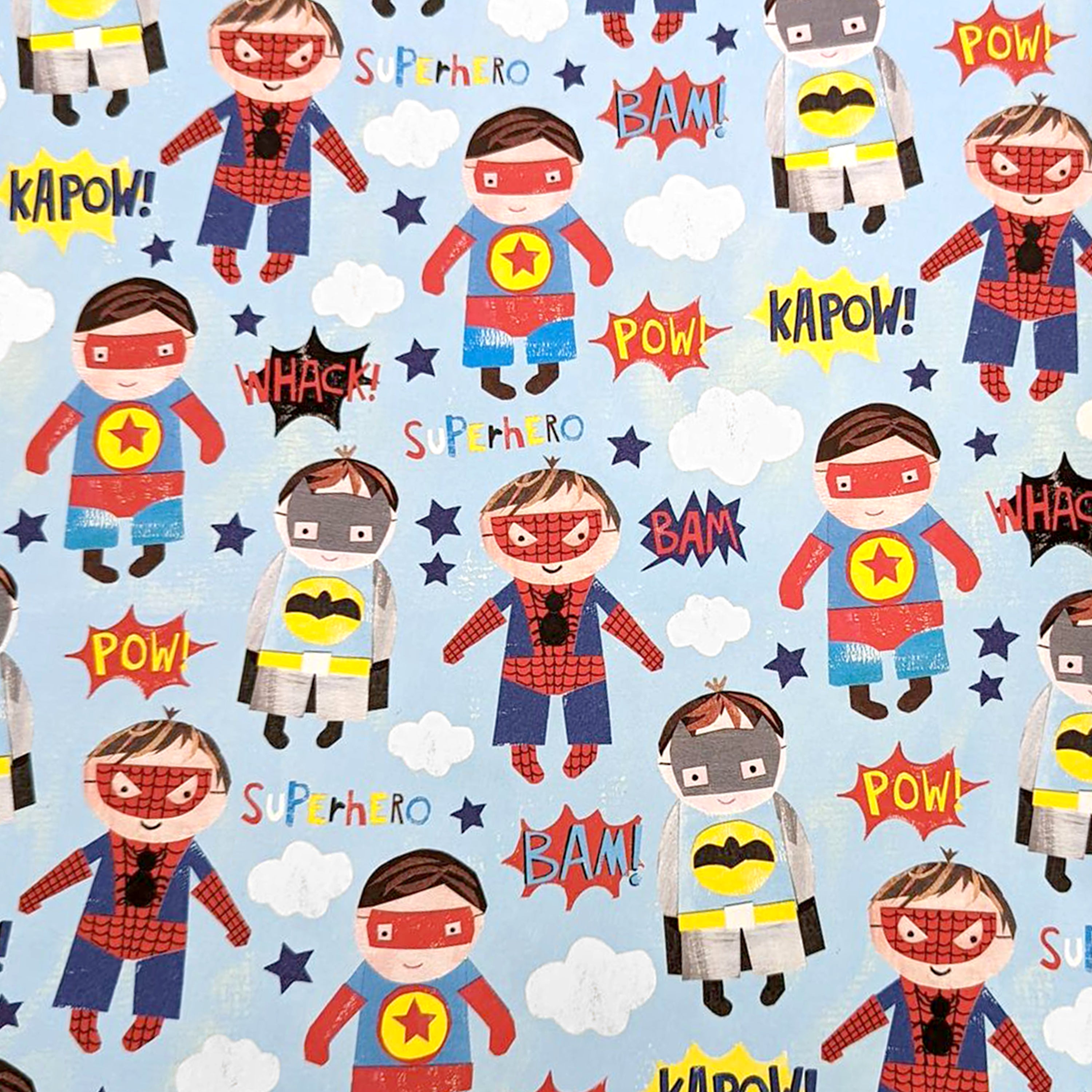 Super! Featuring some of their favourite superheroes including Spiderman and Batman, this gorgeous kids wrapping paper is bound to make them smile. A bright and bold wrapping paper with stunning illustrated superheroes and even a superhero boy!
