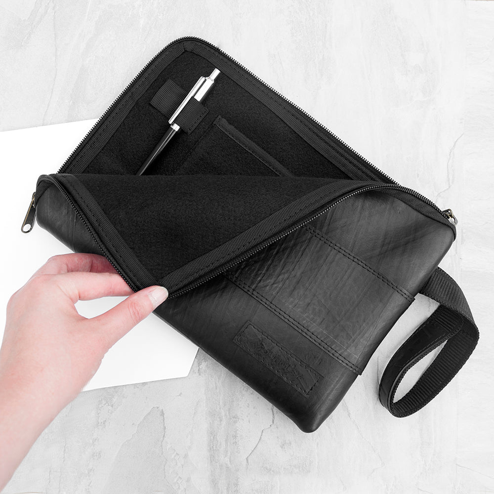 With a soft felt lining, the sleeve also contains an inner pocket suitable for a notebook and a holder for your pens. Additional features include a zip closure and a strong handle.